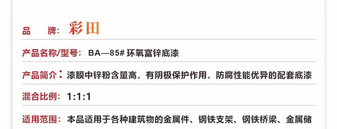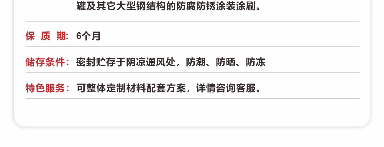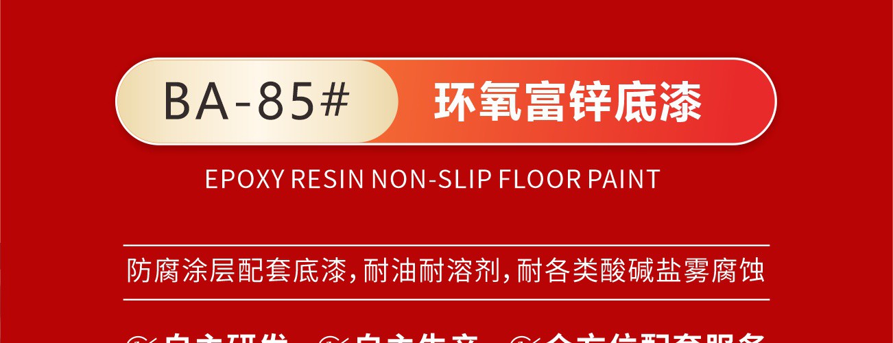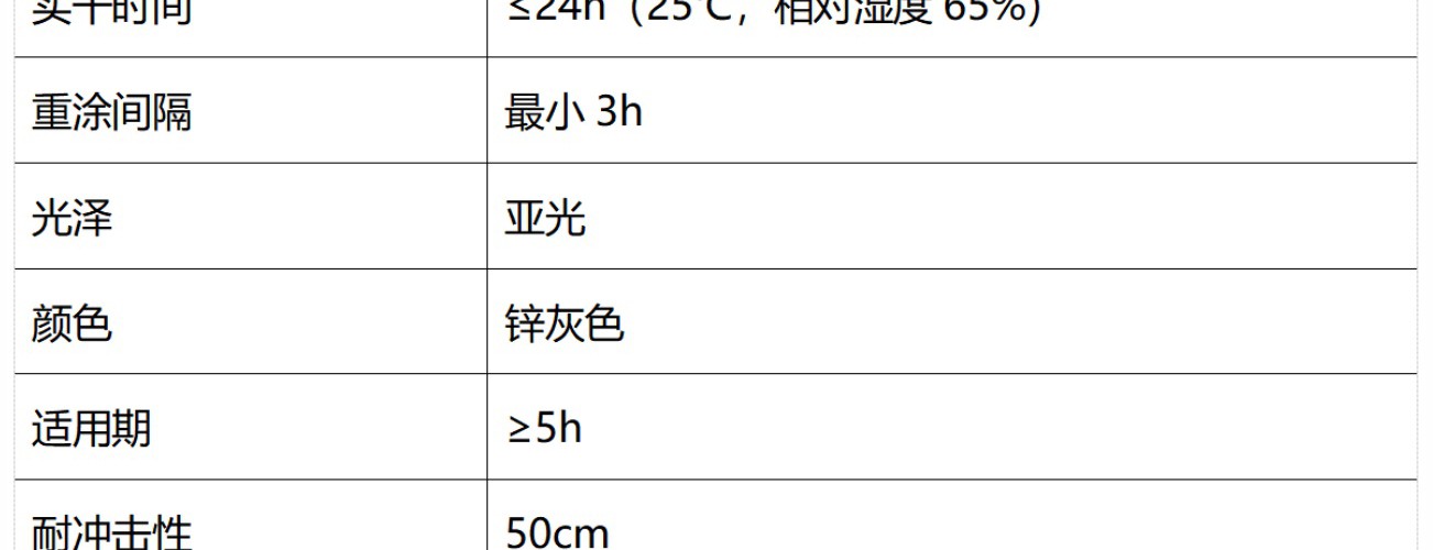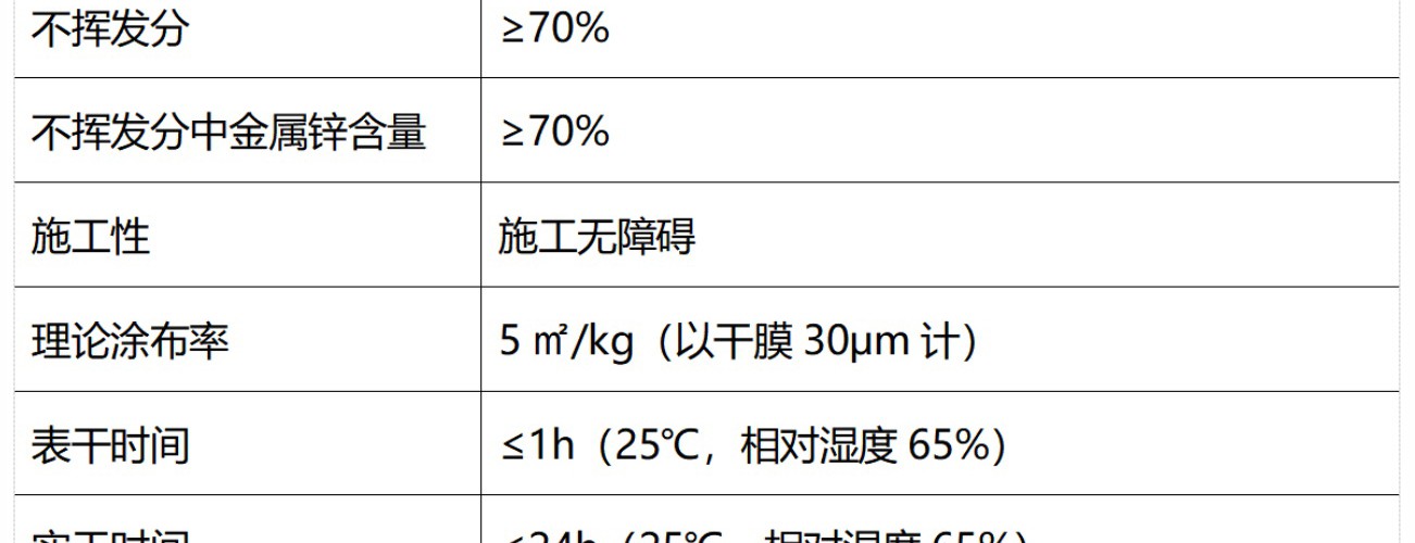 環氧富鋅底漆,鋅粉含量≥70%,適用于各種建筑物的金屬件、鋼鐵支架、鋼鐵橋梁、金屬儲罐及其它大型鋼結構的防腐防銹涂裝涂刷。 特 性:優異的防腐蝕性能;優良的耐油性、耐溶劑性、耐水性及耐鹽霧性;良好的基材表面附著力。
