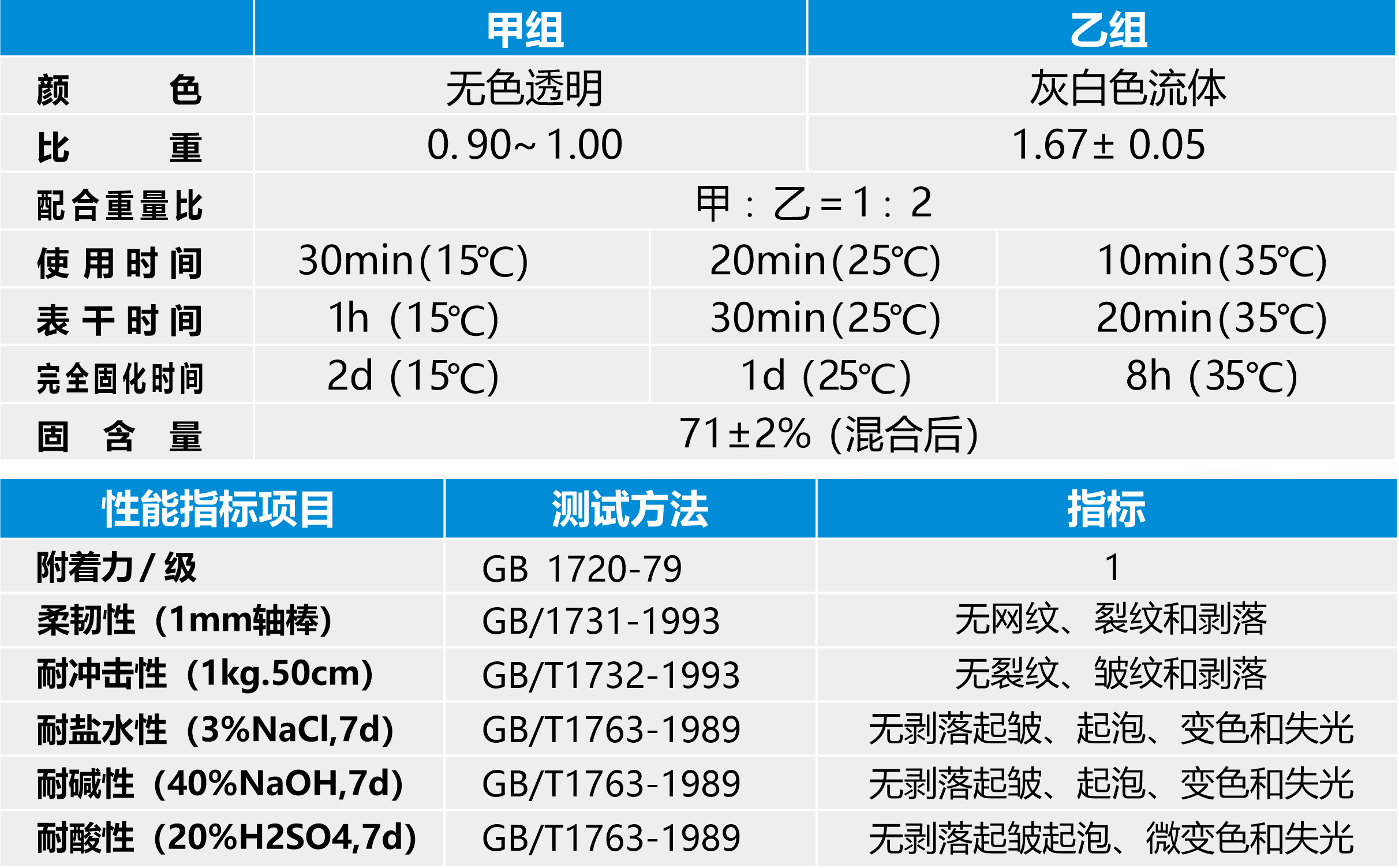 混合:貯存過程中,乙組可能會出現輕微沉淀,混合前先將乙組充分攪拌均勻;按比例將甲、乙組份倒入攪拌桶后攪拌均勻,混合立即施工。